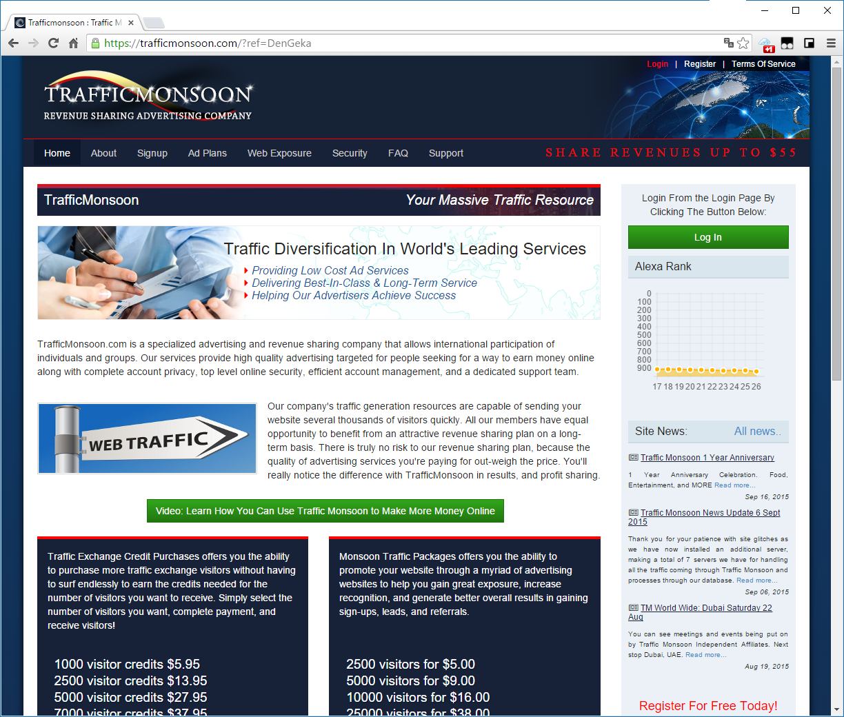 - компании TrafficMonsoon 3 года, сайт работает уже больше года, посетителей более 874 миллионов;