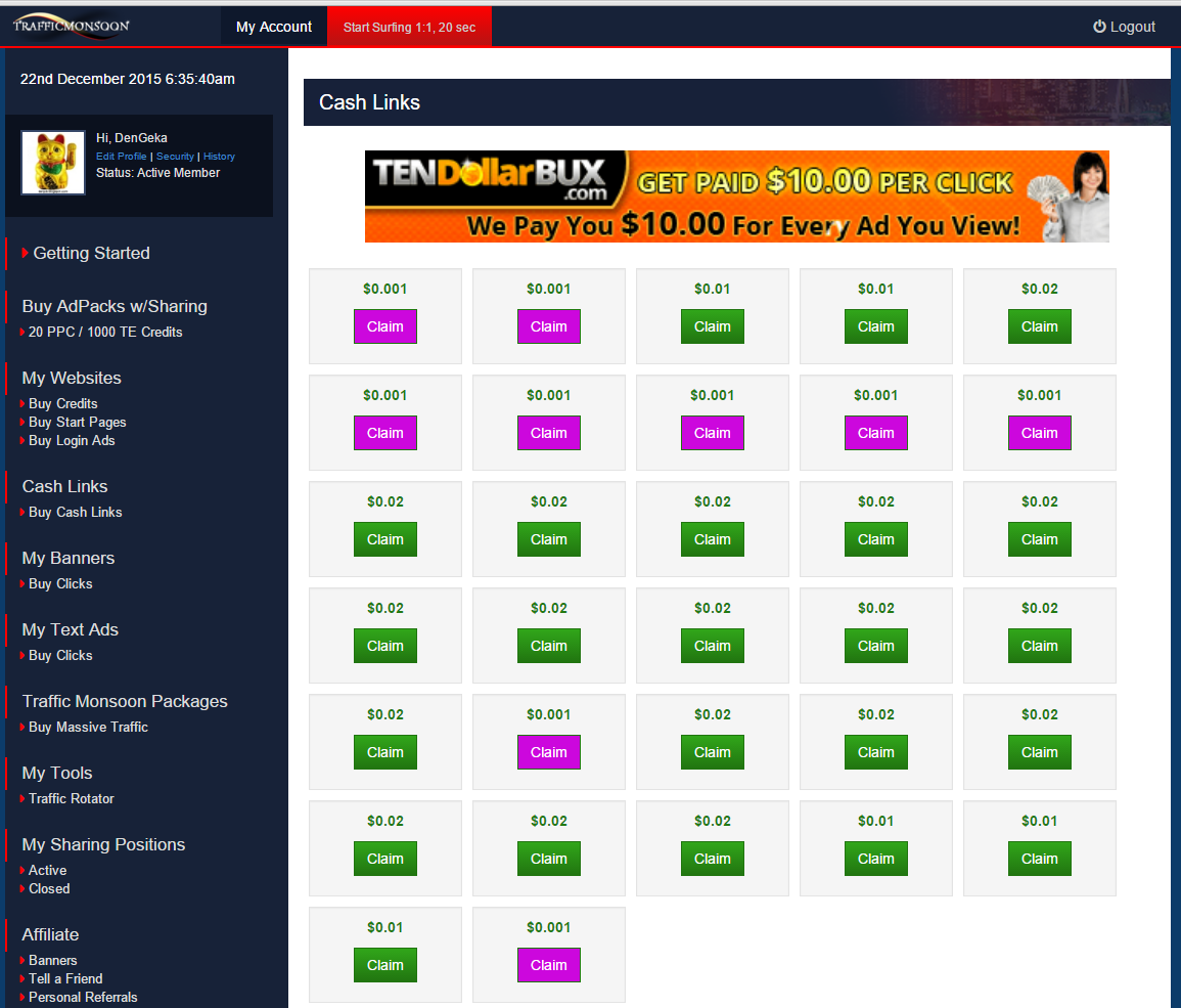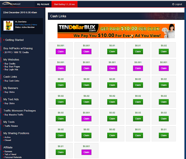Нетрудно посчитать, что за одно посещение сайта TrafficMonsoon (Трафикмонсун), я заработал 41,9 центов (18*2 цента = 36 центов; 5*1 цент = 5 центов; 9*0,1 цента = 0,9 цента; итого 41,9 центов). Решение за Вами: